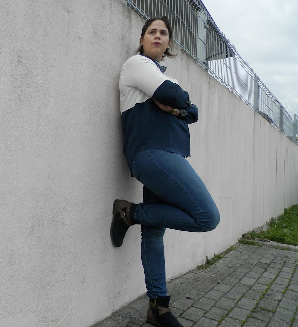Adoro o contraste da camisa, o branco, azul e depois na gola e punhos o preto - cabedal!